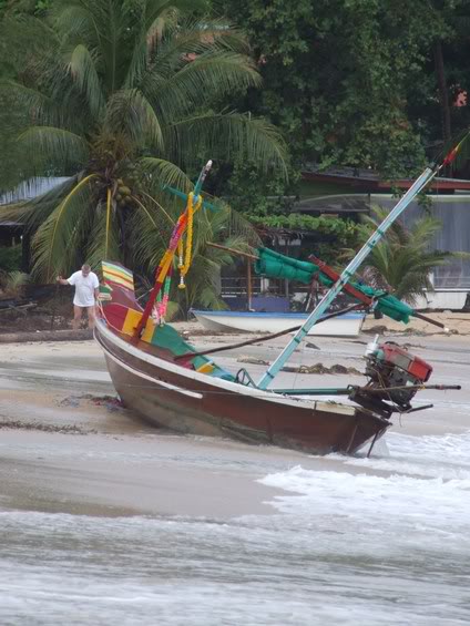 Bølger på små 4 meter knækkede ganske enkelt ankertovene, og knækkede et af 'hornene' som man normalt bruger til fortøjning, og båden blev kastet sidevers ind mod stranden. En englænder jeg havde ringet til, kunne også blot stå og se på at hans Bayliner han har til salg for 945.000 Bht, ligeledes blev smidt op på stranden som et stykke legetøj, det til trods for at han normalt ligger for anker mere end 50 meter ude??