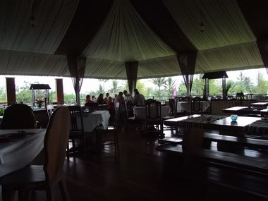 Et meget smukt sted med udsigt til bjergene og rismarkerne som desværre i dag på grund af skyer ikke kunne ses. Så i stedet nød jeg den omhu der er brugt for at få stedet til at ligne det Bali man ser i Tv. Sikke en fantasi de mennesker har, alt passer sgu sammen, slet ikke tæt på min ellers så gode smag når jeg blander de forskellige kulørte plastik ting jeg køber i Tesco Lotus