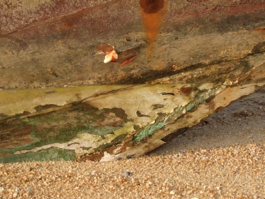 Og der ligger hun godt, alt det vand som kommer ind når tidevandet kommer, løber stille og roligt ud igen når vandet synker. Og som i kan se på billederne er det sgu noget surt træværk, og grunden til det at man har givet hende glasfiber både indvendigt og udvendigt. Så fugten er blevet lukket inde og har fået træet til at rådne væk, så tanken om at få hende fragtet over på fastlandet engang er helt udelukket med de store huller der er i hende. Så vi må finde en her på øen der kan fikse hende !!