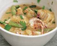 Tilsæt kokosmælk, bouillon eller vand, fiskesauce og sukker. Bring det til simrepunktet og lad det simre uden låg 20-25 minutter. |