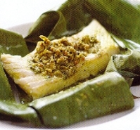 Saml bananblade med stegenåle eller tandstikker til firkantede små skåle, læg et lag strimlet kinakål i bunden af hver og læg fiskemassen over. |
