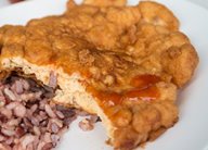Kom svinekødet, forårsløg, mini majs, sukker ærter og koriander over æggemassen og læg låg på. Steg omeletten ved moderat varme, til æggene begynder at stivne. Fold halvdelen af omeletten over den anden halvdel og steg videre, til æggemassen i midten er stivnet, pynt omeletten med frisk koriander |