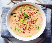 Tilsæt limesaft, bouillon og fiskesauce, og smag suppen til. Tilsæt eventuelt en smule sukker. Server suppen med radiser skåret i tynde skiver og et drys chili. |