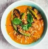 Pil løg og hvidløg, og hak begge dele fint sammen med ingefæren. Varm olie op i en stor gryde. Svits løg, hvidløg og ingefær i olien og tilsæt karry, gurkemeje og spidskommen. Ladkrydderierne brænde en smule af, inden de hakkede tomater tilsættes. Lad tomaterne koge med i ca. 10 minutter, og tilsæt derefter kokosmælk. |